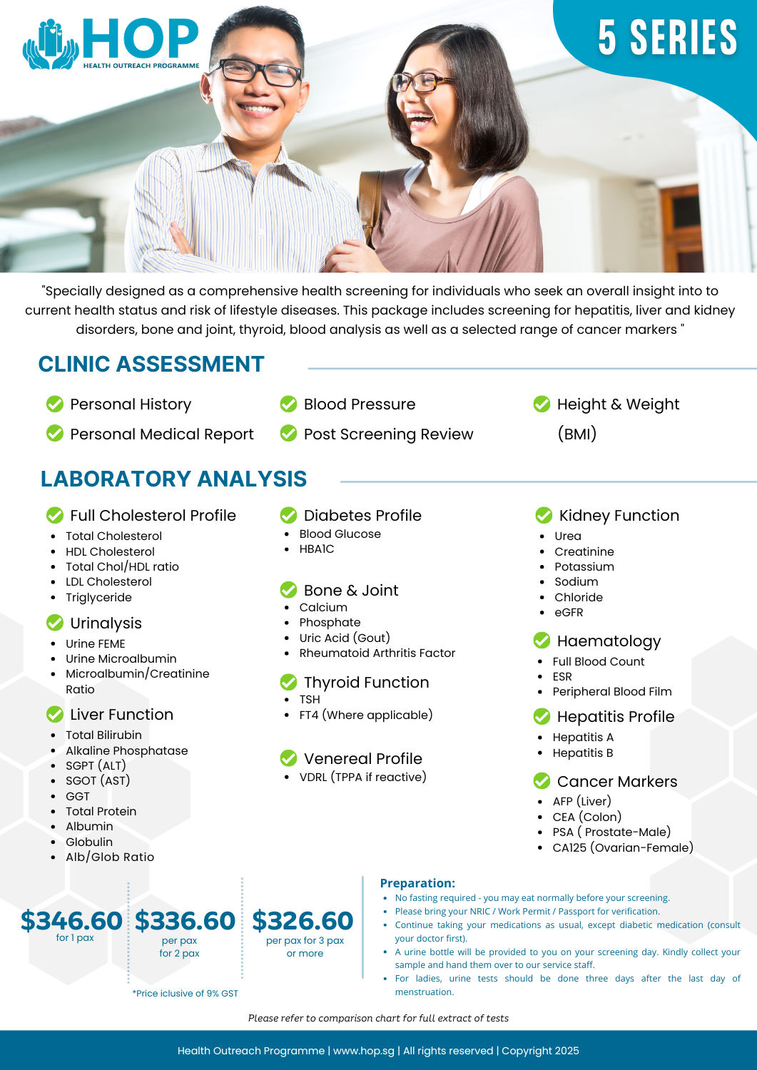 Specially designed as a comprehensive health screening for individuals who seek to get a better insight and understanding into their current health status and risk of lifestyle diseases. This package includes testing into key body functions (liver, kidney, bone and joint, thyroid, full blood count) as well as a selected range of cancer markers.