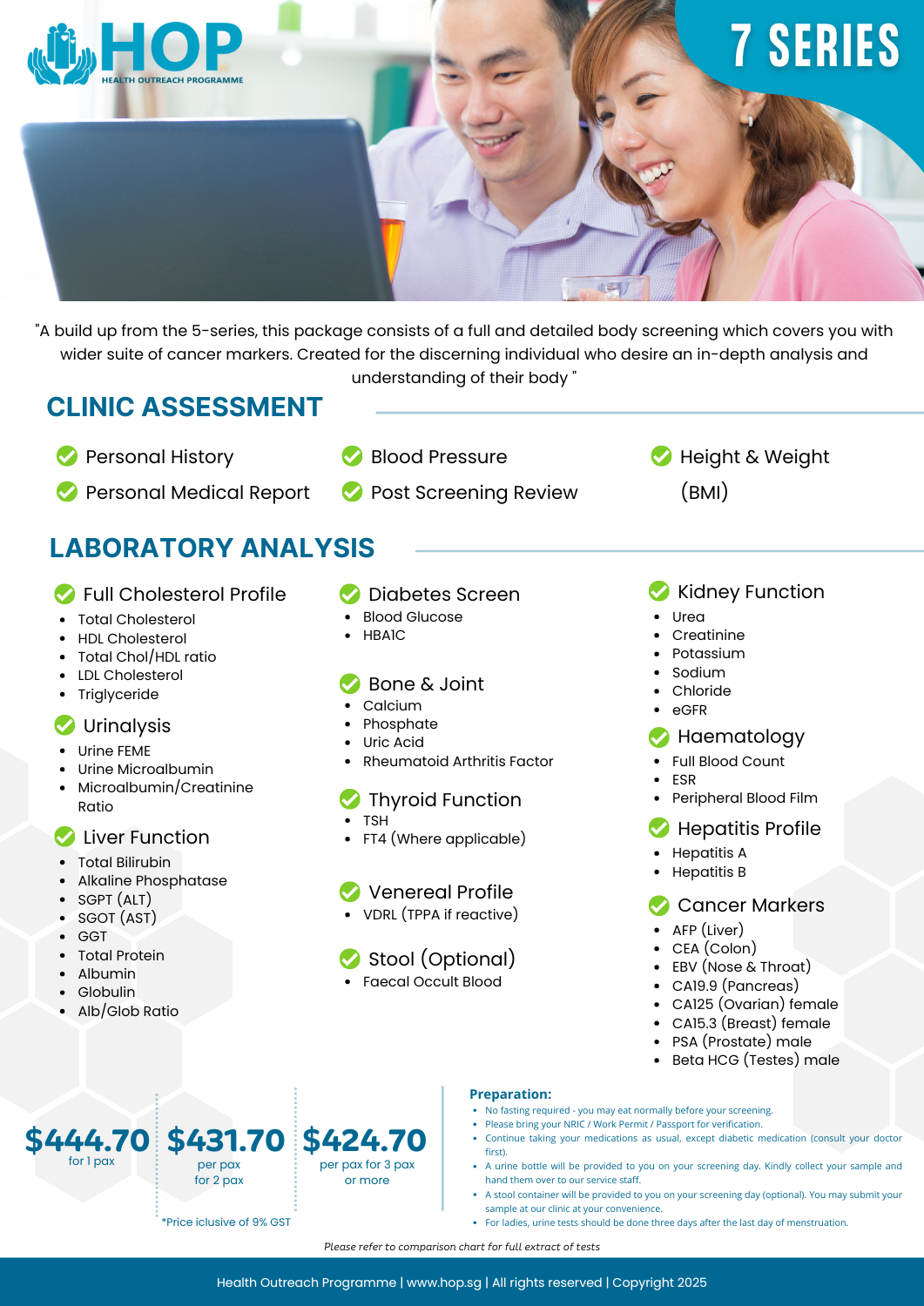 A build up from the 5-series, this package consists of a full and detailed body screening which covers you with wider suite of cancer markers and inclusion of a cardiac risk assessment. Created for the discerning individual who desire an in-depth analysis and understanding of their body.